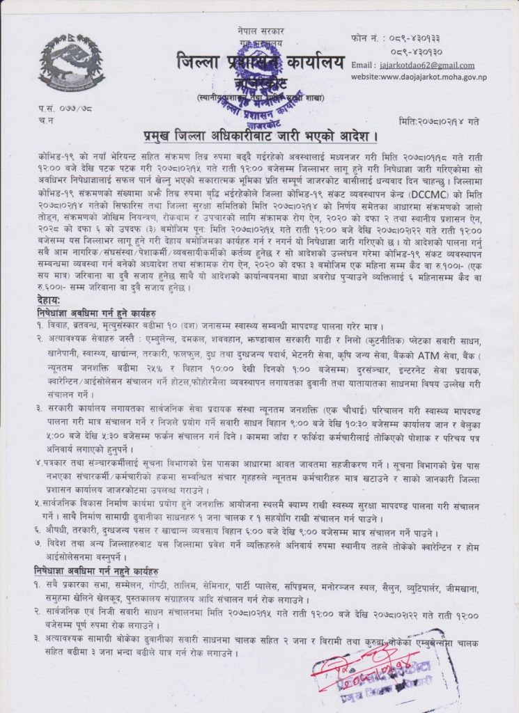 जाजरकोट, जेठ १४ : जाजरकोटमा निषेधाज्ञा (लकडाउन)को अवधी पुनः एक साता थप गरिएको छ ।
