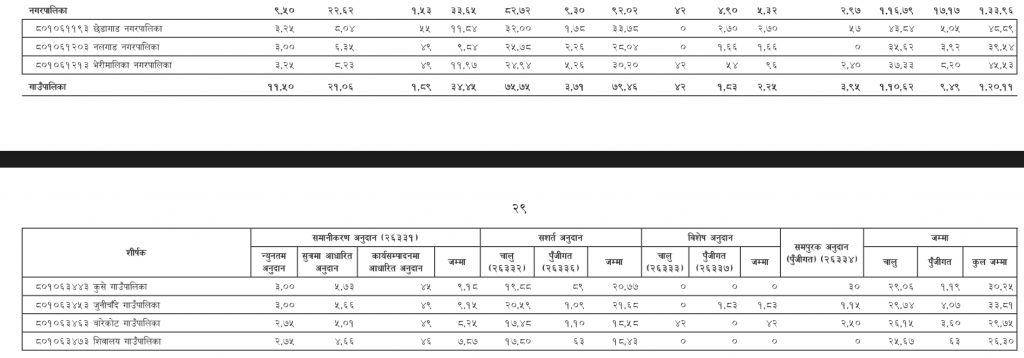 आउँदो आर्थिक वर्षका लागि सार्वजनिक भएको बजेटअनुसार गाउँपालिकामा एक खर्ब ३९ अर्ब १९ करोड, नगरपालिकामा एक खर्ब २३ अर्ब ९६ करोड, उपमहानगरपालिकामा नाै अर्ब ७६ करोड र महानगरपालिकामा १० अर्ब नाै करोड रुपैयाँ हस्तान्तरण हुने भएको छ ।
