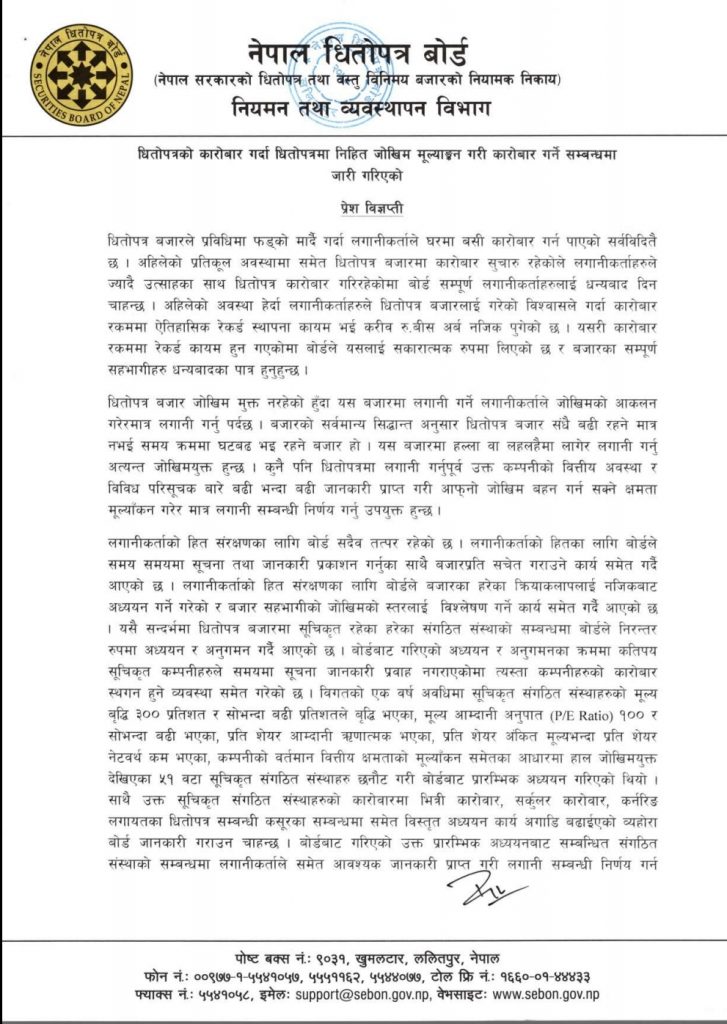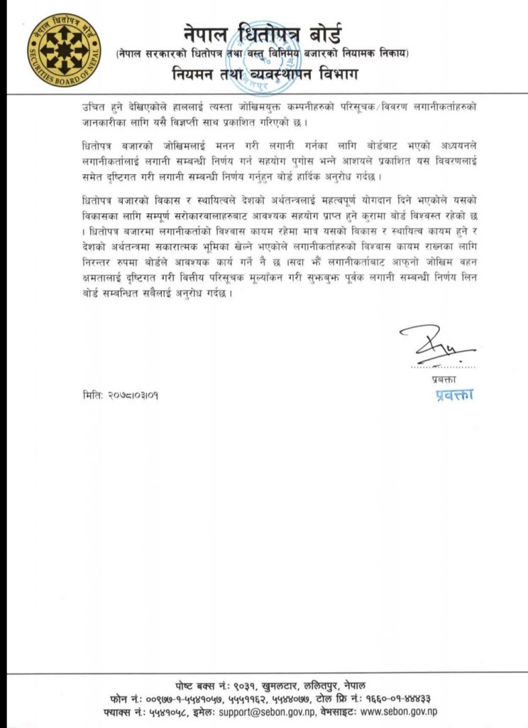 धितोपत्र बजार जोखिम मुक्त नरहेको हुँदा यस बजारमा लगानी गर्ने लगानीकर्ताले जोखिमको आकलन गरेरमात्र लगानी गर्नु पर्ने लगानीकर्ताहरुलाई बोर्डको सुझाव छ ।