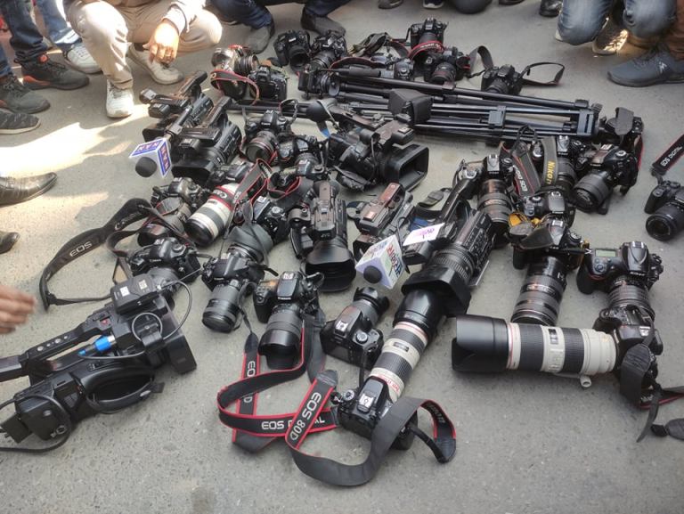 फोटो पत्रकारहरुले क्यामेरालाई सडकमा राखेर विरोध जनाएका थिए। बिहान ८ बजेदेखि हुनुपर्ने मतदान साढे तीन घन्टा ढिलो गरि सुरू भएको छ।