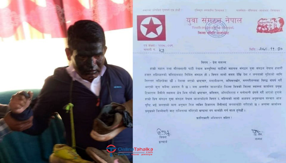 नेत्रविक्रम चन्द (विप्लव) नेकपा निकट यूवा संगठन नेपाल जाजरकोटले स्वास्थ्य सेवा कार्यालयका प्रमुख टिकाराम जैसीलाई कालोमोसो र जुत्ताका माला लगाएर कारबाहि गरेको बिज्ञप्ती मार्फत जानकारी गराएको छ ।संगठनका जाजरकोट जिल्ला ईन्चार्ज विवश र अध्यक्ष डि.आर.ले आज सोमबार एक संयुक्त बिज्ञप्ती जारी गरेर भ्रष्टाचारी, कमिसनखोर, अनियमितता, मनोमानीको आरोप लगाउनदै कालोमोसो र जुत्ताको माला लगाइएको जानकारी दिनुभयो ।