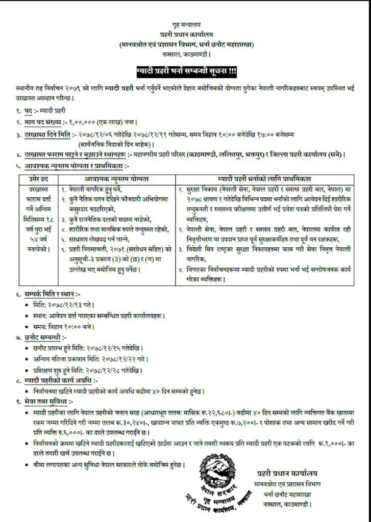 नेपाली नागरिकले चैत ६ गतेदेखि ११ गतेसम्म आवेदन दिन सकिने विज्ञापनमा उल्लेख छ। म्यादी प्रहरीले ४० दिन काम गर्नुपर्ने र त्यसका लागि ३० हजार २४० रुपैँया तलब तोकिएको छ। त्यसका अलावा खाद्यान्नबापत ७ हजार दुई सय र खाद्यान्नबापत ६ हजार भत्ता तोकिएको छ। सबै गरेर प्रतिव्यक्ति म्यादी प्रहरीले ४३ हजार बढी रुपैँया पाउनेछन्। म्यादी प्रहरीमा भर्ना हुन् १८ देखि ५४ वर्ष हुनुपर्ने बताइएको छ।
