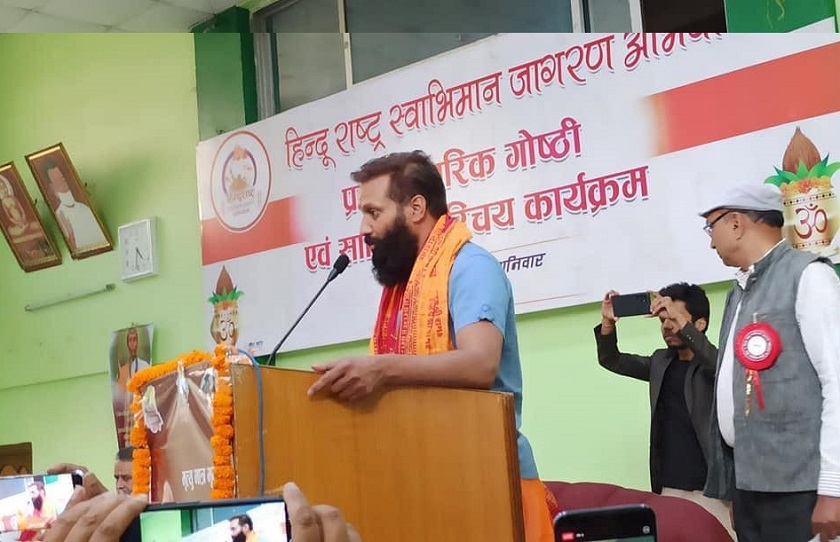 उनले हिन्दू धर्म आफूहरुको पहिचान भएकोे बताउँदै समयमै नेपाल हिन्दू राष्ट्र कायम हुन नसके यसको अस्तित्व नै समाप्त हुने भन्दै चिन्ता व्यक्त गरे । उनले राष्ट्रको हजारौं बर्ष पुरानो विशिष्ट पहिचान हिन्दुत्व नै रहेकोले यसको संरक्षण गर्न आवश्यक रहेको बताए ।