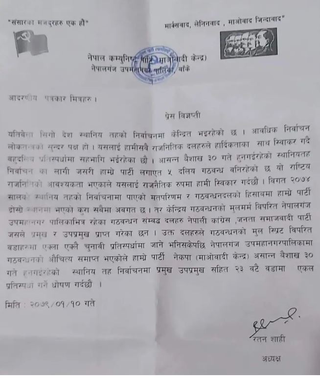 उक्त दलहरुले गठवन्धनको मुल स्प्रिट विपरित वडाहरुमा एक्ला एक्लै चुनावी प्रतिस्पर्धामा जाने भनिसकेपछि नेपालगंज उपमहानगरपालिकामा गठवन्धनको औचित्य समाप्त भएकोले हामो पार्टी नेकपा (माओवादी केन्द्र) असान्न बैशाख ३०