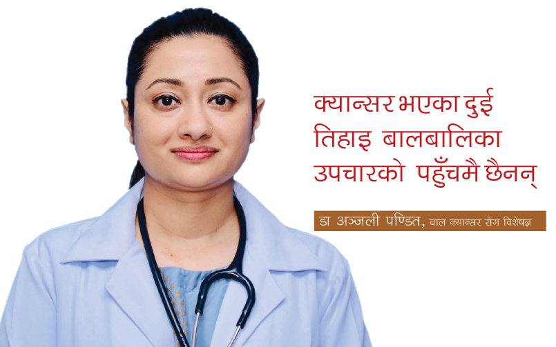 डा पण्डितका अनुसार नेपालमा वर्षेनी एक हजार पाँच सयदेखि दुई हजार जना बालबालिकालाई क्यान्सर हुने गरेको छ। बाल क्यान्सरको विषयमा नेपाल क्यान्सर हस्पिटल एन्ड रिसर्च सेन्टर, हरिसिद्धीमा कार्यरत बाल क्यान्सर रोग विशेषज्ञ डा अञ्जली पण्डितसँग को कुराकानीः