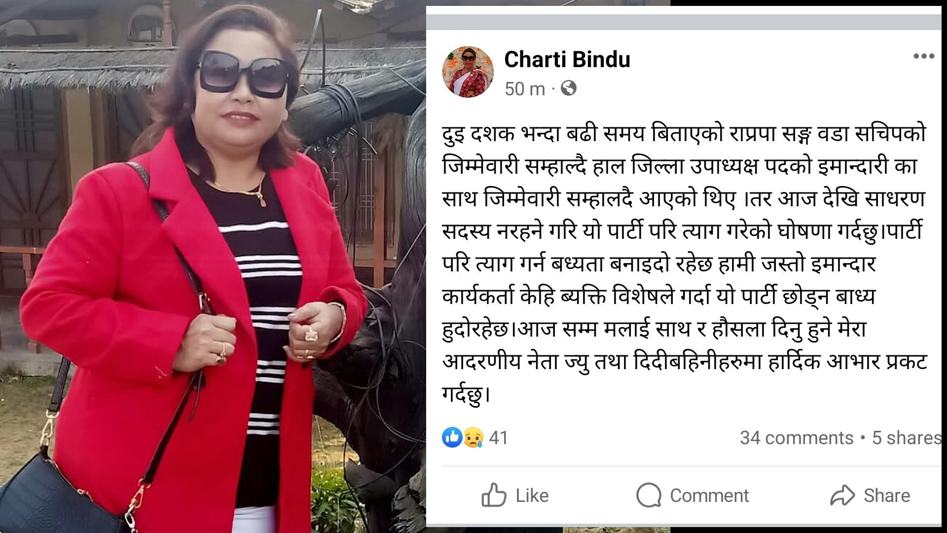 चुनावको मुखमै राप्रपा बाँकेकी जिल्ला उपाध्यक्ष बिन्दुले राप्रपा त्यागिन !