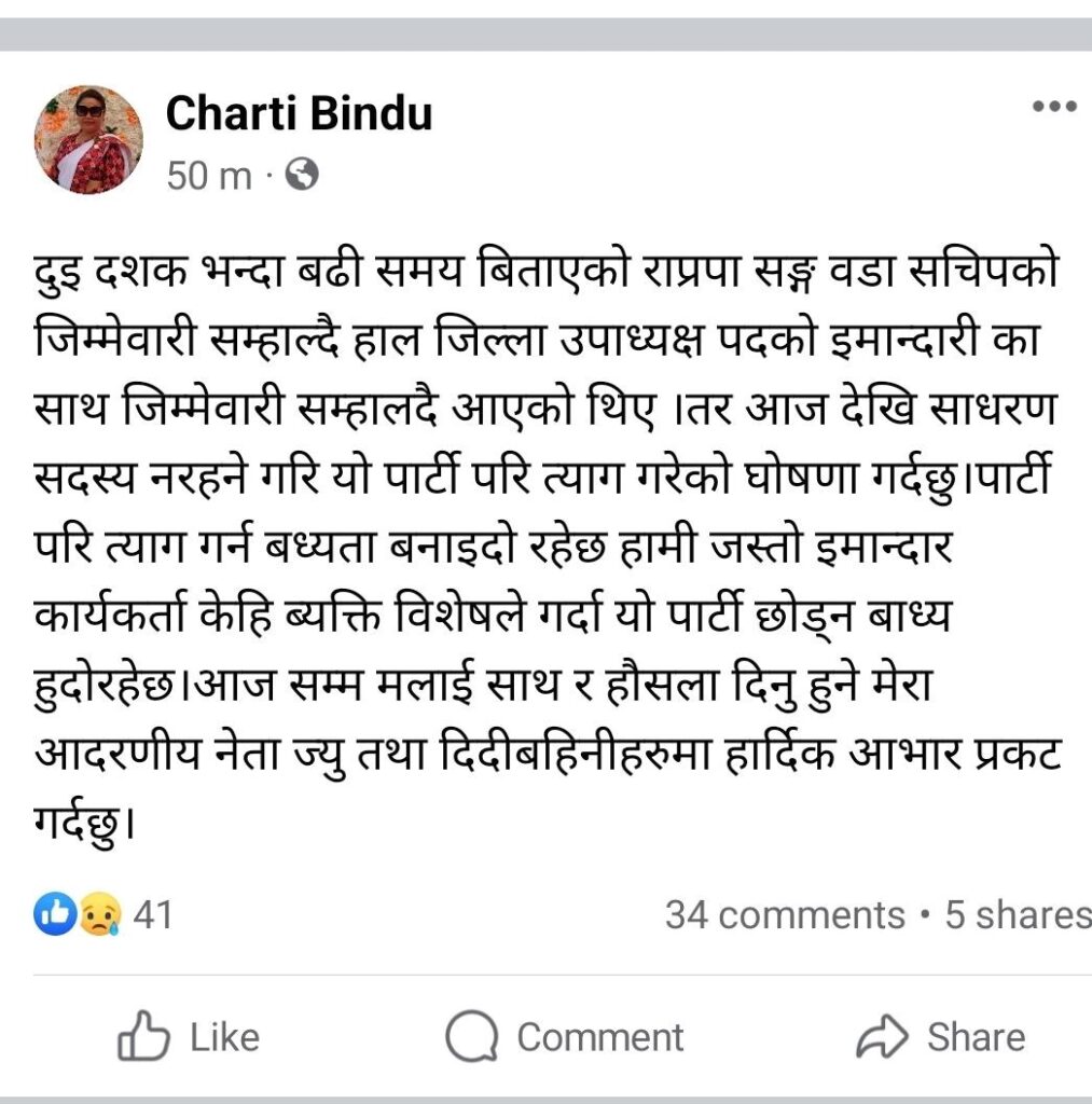 ‘दुइ दशक भन्दा बढी समय बिताएको राप्रपा सङ्ग वडा सचिपको जिम्मेवारी सम्हाल्दै हाल जिल्ला उपाध्यक्ष पदको इमान्दारी का साथ जिम्मेवारी सम्हालदै आएको थिए ।तर आज देखि साधरण सदस्य नरहने गरि यो पार्टी परि त्याग गरेको घोषणा गर्दछु।पार्टी परि त्याग गर्न बध्यता बनाइदो रहेछ हामी जस्तो इमान्दार कार्यकर्ता केहि ब्यक्ति विशेषले गर्दा यो पार्टी छोड्न बाध्य हुदोरहेछ।आज सम्म मलाई साथ र हौसला दिनु हुने मेरा आदरणीय नेता ज्यु तथा दिदीबहिनीहरुमा हार्दिक आभार प्रकट गर्दछु।’