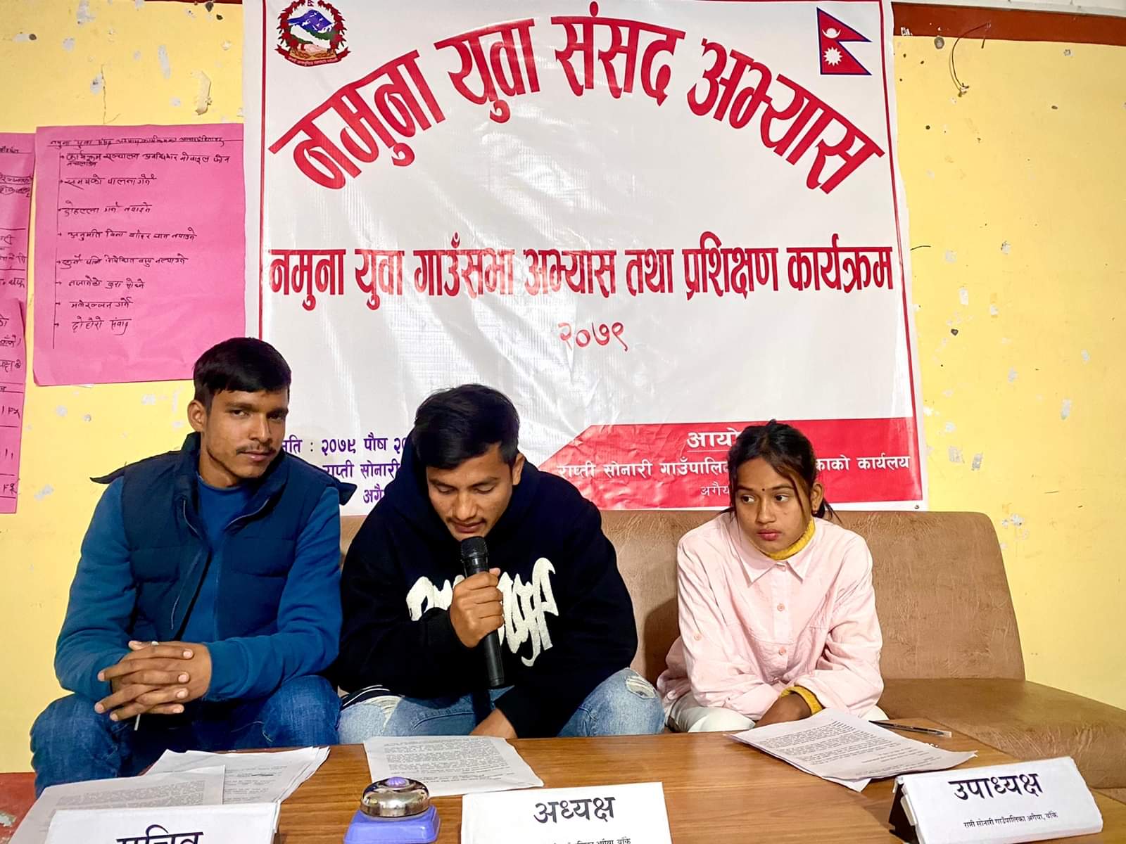 राष्ट्रिय युवा परिसदद्वारा नमुना युवा संसद अभ्यास कार्यक्रमअन्तर्गत एक जिल्ला एक पालिकामा प्रशिक्षण दिइरहेकोमा बाँकेको राप्ती सोनारी गाउँपालिका अन्तर्गतका ९ वटै वडाका युवाहरुलाई सहभागिता गराइएको राष्ट्रिय युवा परिषद्का प्रशिक्षक युवराज जोशीले बताए । साथै सहभागीहरुलाई जोशीसहित परिषद्का प्रशिक्षक समिरअलि बेहना, युवराज खड्काले पनि प्रशिक्षण दिए ।