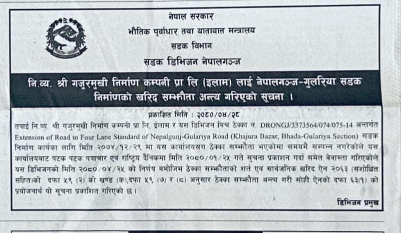 तीन पटक म्याद थप र त्यस यता पनि लगातार बिभिन्न सुबिधा दिएर काम गर्ने अवसर दिँदा पनि ठेकेदार कम्पनी गजुरमुखी कन्ट्रक्सनबाट काम हुन नसकेपछि सम्झौता तोडिएको सडक डिभिजन कार्यालय नेपालगन्जका प्रमुख निरज शाक्यले जानकारी दिए ।