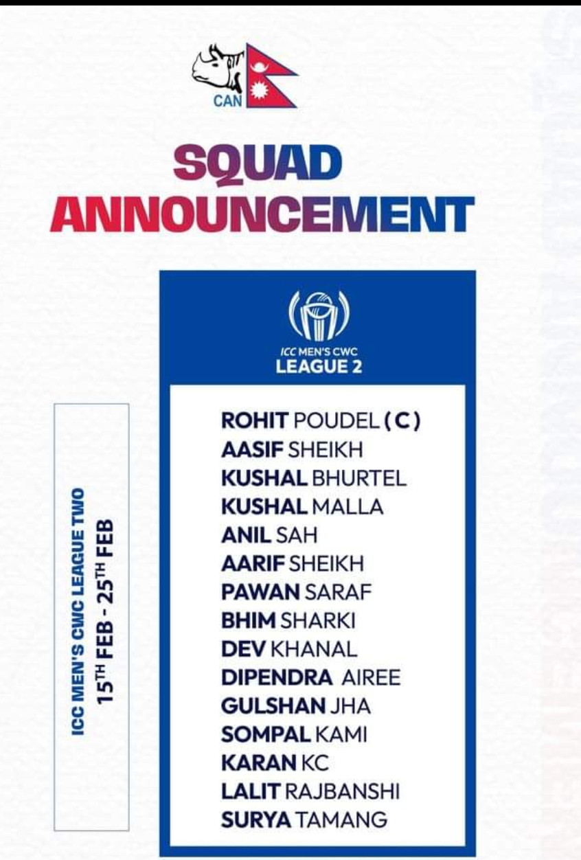 नेपालगन्ज : आईसीसी विश्वकप एकदिवसीय क्रिकेट लिग–२ अन्तर्गतको पहिलो सिरिज खेल्ने नेपाली टोलीमा अनिलकुमार शाह र देव खनाल समेटिएका छन् ।