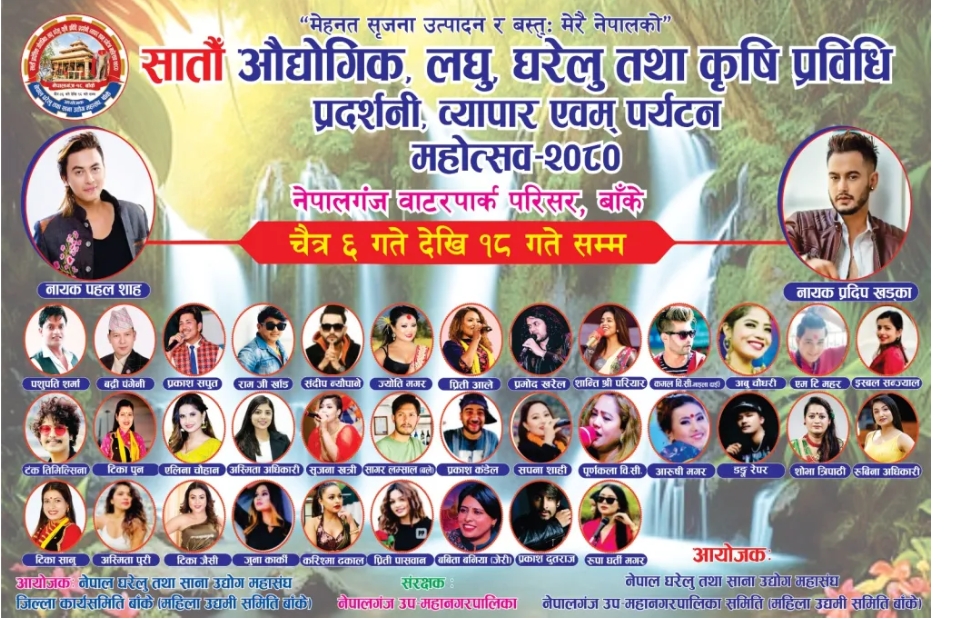 नेपालगन्ज ७ चैत्र ः नेपालगन्जको वाटरपार्कमा मङ्गलबारदेखि सुरु भएको सातौँ प्रादेशिक औद्योगिक लघु, घरेलु तथा कृषि, व्यापार एवम् पर्यटन महोत्सवको तेस्रो दिन बिहीबार ज्योती मगरको बेजोड प्रस्तुती रहने भएकोछ । प्रतिकुल मौसमका कारण बुधबार ज्योती मगरसहितका राष्ट्रिय कलाकारको प्रस्तुती हुने पूर्वनिर्धारित कार्यक्रम बिहीबार हुने भएको हो । बुधबार स्थानीय कलाकारले आफ्नो प्रस्तु्तीमार्फत दर्शकलाई नचाए । […]